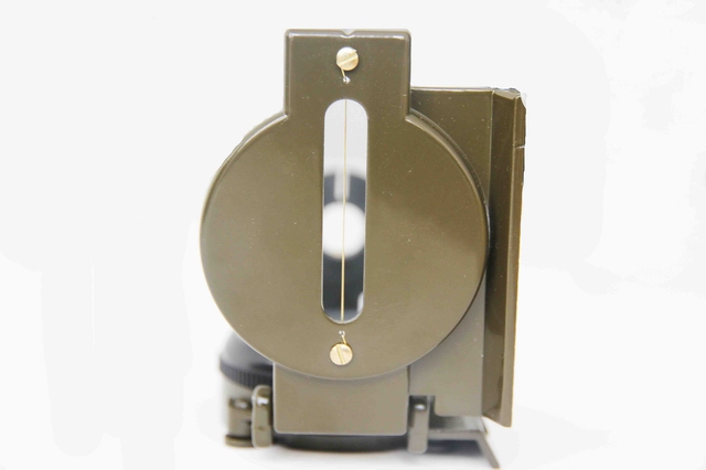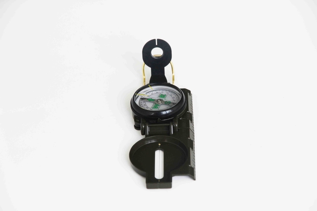 1.測方位角:展開指北針,轉(zhuǎn)動方位框使方位玻璃上的刻度線與方向指標相對正,將平視鏡斜放(45°)單眼通過準星瞄向目標,從平視鏡反射看到磁針N極所對反字表牌上方位分劃,既可讀出目標方位角,然后用右手轉(zhuǎn)動方位框使方位玻璃上的刻度線與磁針N極對準,此時方向指標與方位玻璃刻度線所夾之角即為目標方位角(按順時針方向計算)。打開指北針,標定好地圖(測距時可不標定地圖),在圖上基準點處插一扎針,轉(zhuǎn)動指北針,使側(cè)尺邊切于目標點,即可判讀出基準點至目標點的方位角。