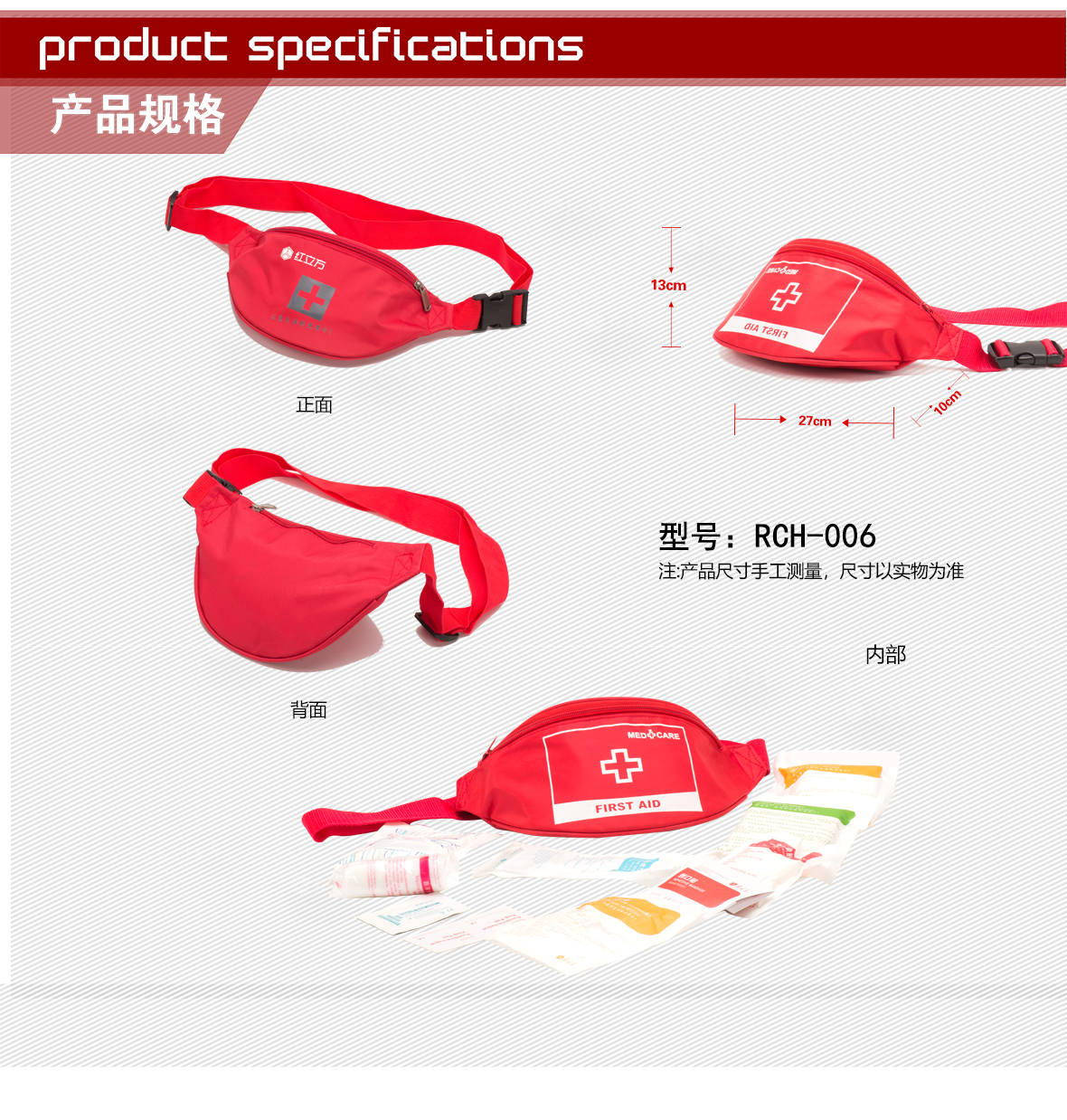 | 型號(hào):RCH-006戶外急救包 | 外 包材質(zhì):滌綸 | 顏色:紅色 | ||||||