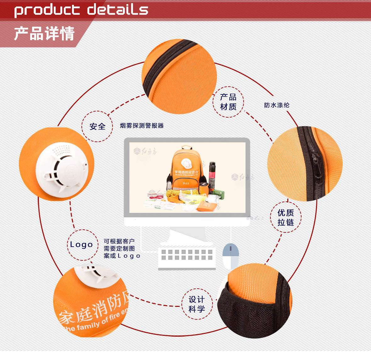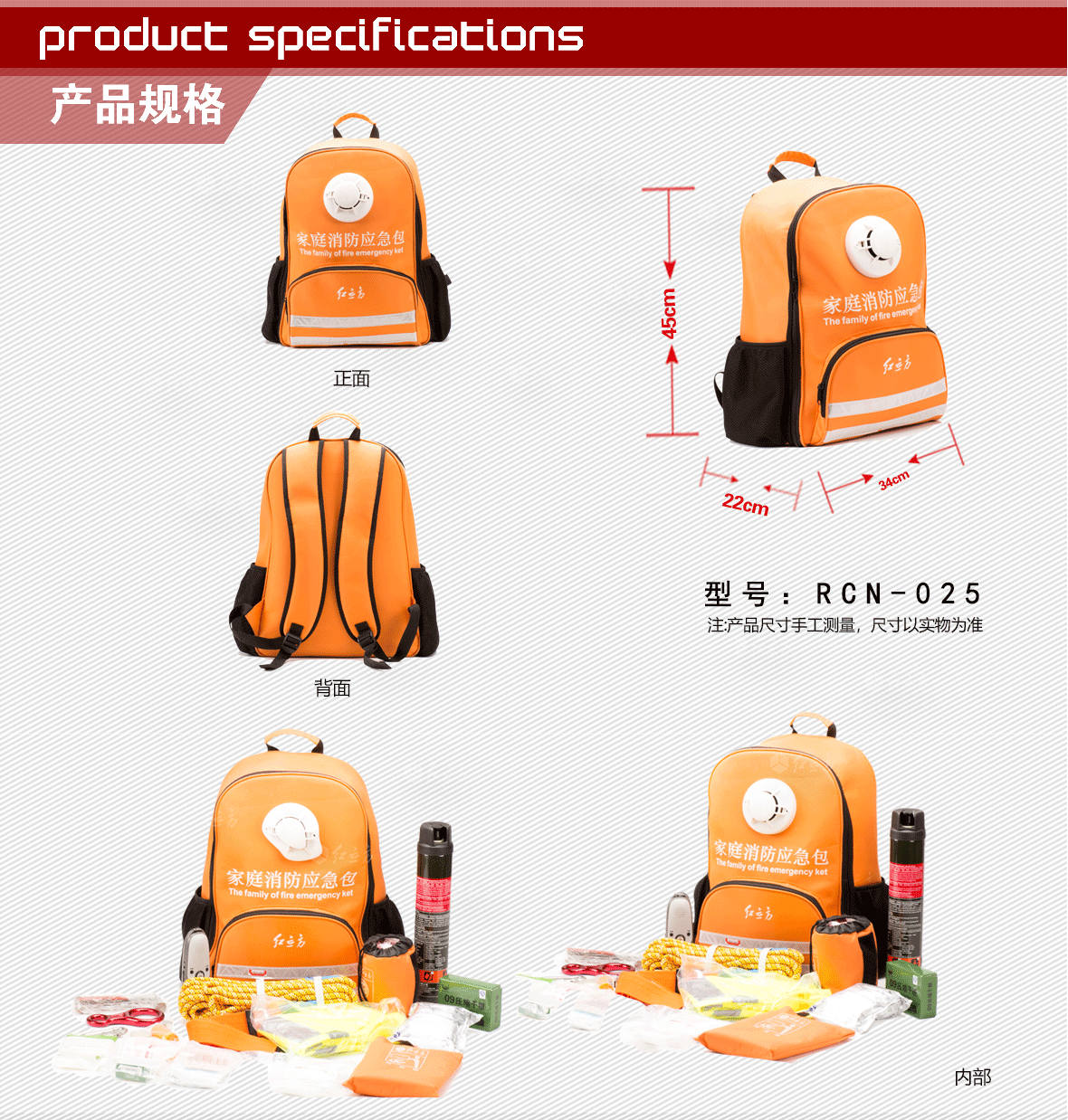 | 型號:RCN-025家庭應(yīng)急包 | 外包材質(zhì):600D滌綸 | 顏色:橘黃 | ||||||